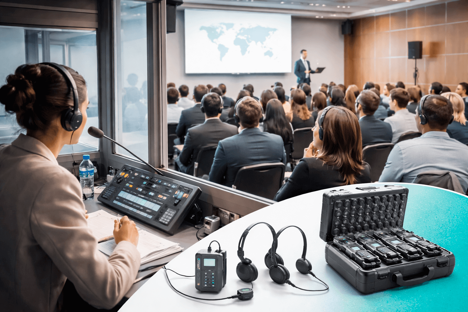 Asegura el respaldo tecnológico de tus eventos multilingües con body packs, cabinas, micrófonos, receptores, pantallas. Proveemos equipos profesionales que garantizan audio claro, transmisión confiable y una experiencia fluida, para que cada mensaje llegue con precisión a todos los asistentes.